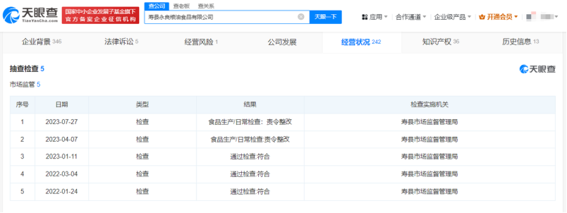 ÌìÑÛ²éÐÐÕþ´¦·£ÐÅÏ¢ÏÔʾ£¬2023Äê4ÔÂ13ÈÕ£¬ÊÙÏØÓÀÁ¼Á¸ÓÍʳƷÓÐÏÞ¹«Ë¾ÒòÐé¼ÙÐû´«±»»´ÄÏÊÐÊг¡¼à¶½¹ÜÀí¾Ö·£¿î200ÍòÔª¡£´¦·£ÊÂÓÉÏÔʾ£¬µ±ÊÂÈËΪÁË»ñµÃÊг¡¾ºÕùÓÅÊÆ£¬Ìá¸ß´óÃ×ÏúÁ¿£¬½«ÊÙÏØµ¾¹ÈÉú²úµÄ´óÃ×Ðû³Æ“¶þ´úÌ©¹úÏãÃ×”£¬ÇÒÒÔÆÕͨ´óÃ×¼Û¸ñ½øÐÐÏúÊÛÎüÒýÏû·ÑÕߣ¬Ê¹Ïû·ÑÕß½«¹ºÂòµÄÊÙÏØ²ú´óÃ×ÓëÌ©¹ú²ú´óÃ×»ìÏý£¬ÎóÈÏΪ¹ºÂòµÄÊÇÌ©¹ú´óÃס£³é²é¼ì²éÐÅÏ¢ÏÔʾ£¬ÊÙÏØÊг¡¼à¶½¹ÜÀí¾Ö·Ö±ðÔÚ2023Äê4Ô¡¢7Ô¶ÔÊÙÏØÓÀÁ¼Á¸ÓÍʳƷÓÐÏÞ¹«Ë¾½øÐÐ2´Î³é²é¼ì²é£¬½á¹û¾ùΪ“ÔðÁîÕû¸Ä”¡£