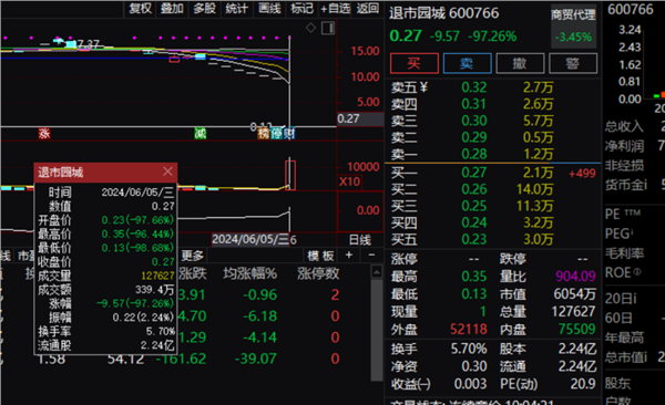 行情数据显示,退市园城今天上午开盘报0.23元,跌幅高达97.66%,盘中进一步下行,一度跌至0.13元,跌幅进一步扩大至98.68%,后股价有所回升。