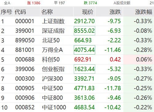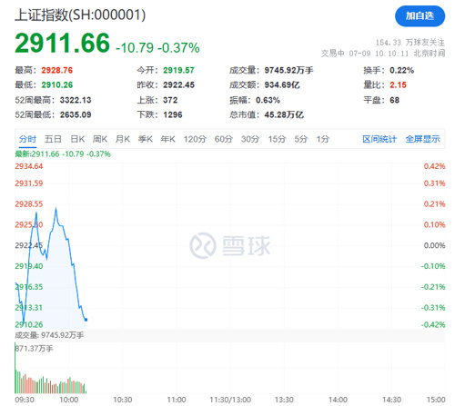 7月9日,A股市场早间小幅低开:上证指数报2919.57点,跌幅为0.1%;深证成指跌0.16%,创业板指跌0.2%。开盘不久后,市场短暂发力冲高,随后震荡回落。截至发稿,A股主要指数绿多红少。