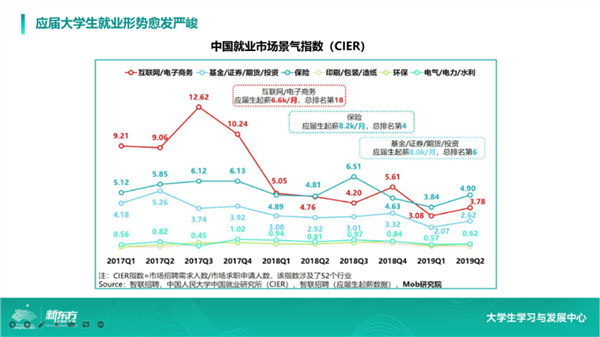 另外,从中国就业市场景气指数也能看出应届大学生的就业形势愈发严峻。尤其在一部分行业里面,还会有非常大的用人需求下降。