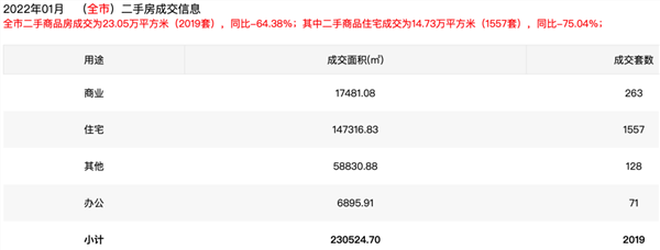 深圳住建局最新发布的数据显示,2022年1月,深圳市二手商品房成交23.05万平方米(2019套),同比下降64.38%;其中,二手商品住宅成交为14.73万平方米(1557套),同比大跌75.04%。