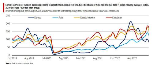 同比增幅之所以上升,部分是由于“基数效应”,2022年1月,奥密克戎的蔓延对服务业支出(尤其是旅游业)造成了冲击。因此,美银预计,美国家庭的信用卡和借记卡消费的同比增速将很快放缓。