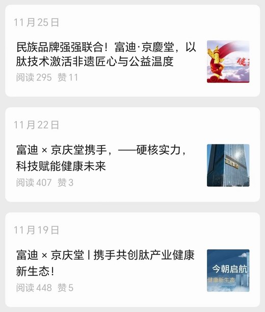 11月19日,11月22日,11月25日,富迪集团公众号连发三篇文章,宣布富迪携手京庆堂。