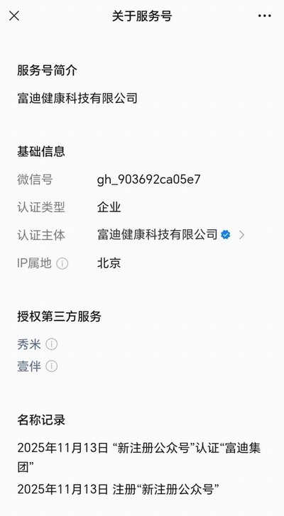 2025年11月13日,富迪健康科技有限公司注册新公众号“富迪集团”,IP属地显示“北京”。